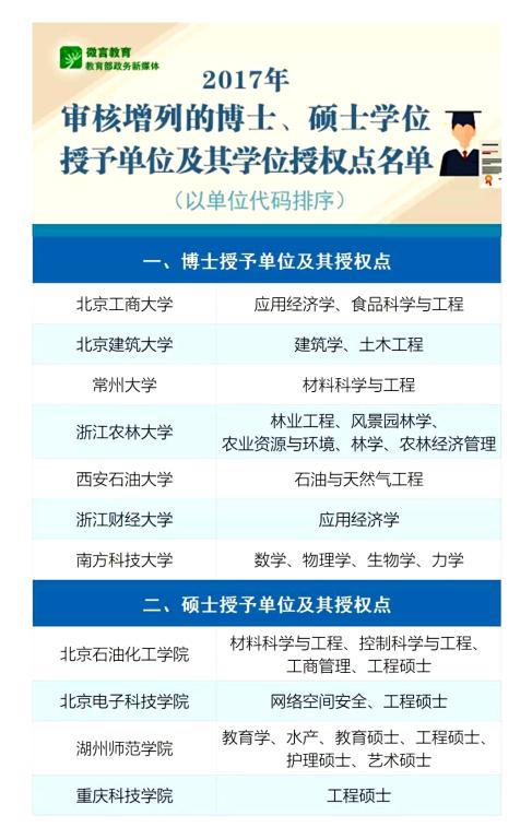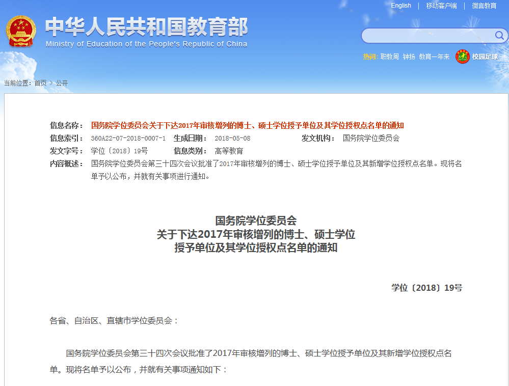 【党委研究生工作部(研究生处)】5月10日,教育部官网发布了《国务院学位委员会关于下达2017年审核增列的博士、硕士学位授予单位及其学位授权点名单的通知》(学位〔2018〕19号)。根据通知精神,在全国2017年增列的29个硕士学位授权单位中,我校是可直接开展硕士研究生招生、培养、学位授予工作的4个硕士学位授予单位之一。