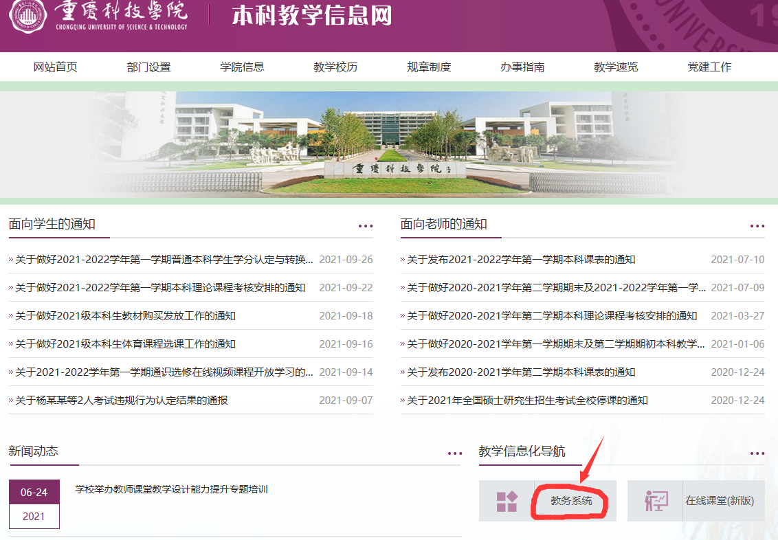因学校正在对教务系统与信息门户的对接方式进行升级测试。在此期间,信息门户暂停单点登录教务系统,请大家通过本科教学信息网(网址:https://jw.cqust.edu.cn/)登录,账号、密码与信息门户一致。