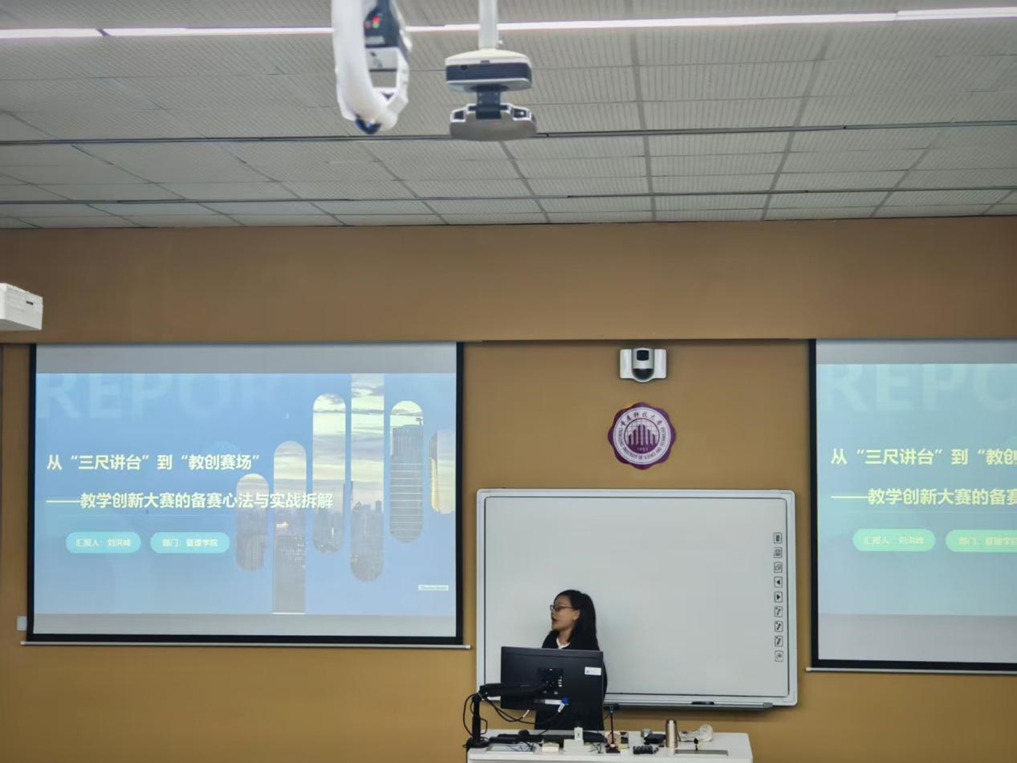 活动中,管理学院刘洪锋老师作了题为《从“三尺讲台”到“教创赛场”——教学创新大赛的备赛心法与实战拆解》的专题分享。她结合自身参赛经历,从教学创新的基本要求、个人心路历程以及如何系统提炼教学创新成果三个方面,进行了全面而深入的剖析。刘老师的讲解内容详实、逻辑清晰,辅以生动的教学案例,为在场教师提供了具有实操价值的备赛指导和教学参考。