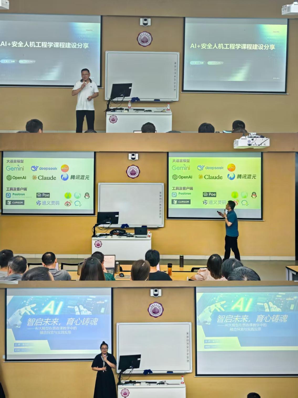 安全科学与工程学院的张薄老师围绕“AI+安全人机工程学课程建设”主题,分享AI+课程教学平台搭建经验,介绍了基于图谱的资源建设、“人机协同”教学模式以及AI辅助随堂测试等实践,体现了AI在增强课堂互动与知识巩固中的积极作用。土木与水利工程学院的贾洪愿老师以“AI赋能教学的三维路径:从课程辅导、能力培养到管理增效”为题分享了在能耗模拟、数据挖掘教学及毕业设计审核中引入AI技术的具体做法,展现了AI在提升教学效率与个性化支持方面的潜力。马克思主义学院的秦悦悦老师立足于思政课程实际,以“智启未来,育心铸魂——AI大模型在思政课教学中的融合探索与实践反思”为题,分享了利用AI大模型构建智能伴学系统、数字人情境教学及闯关式学习等创新实践,为思政课教学注入了新的活力与智慧元素。